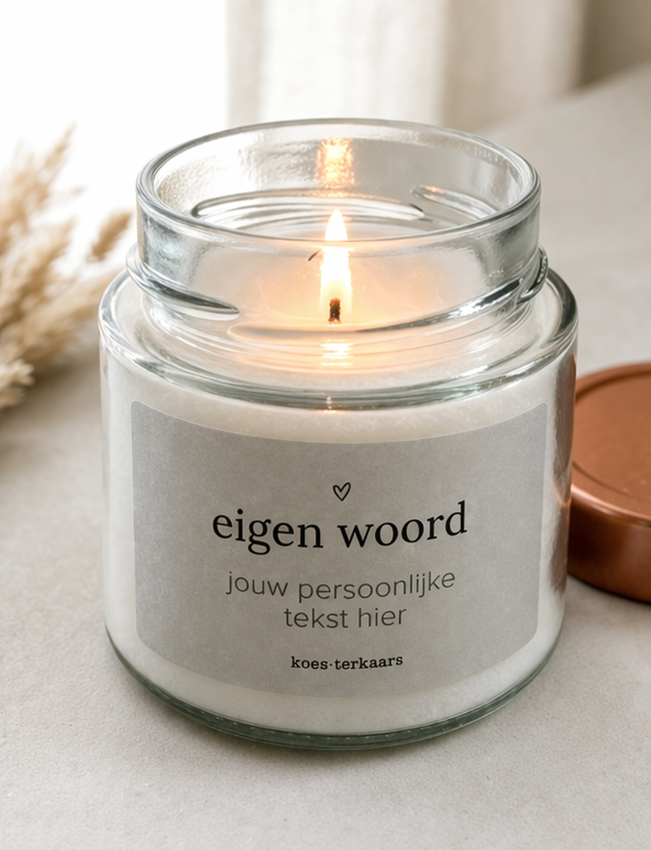 Personaliseer hier jouw koesterkaars met een eigen tekst en geur naar keuze.